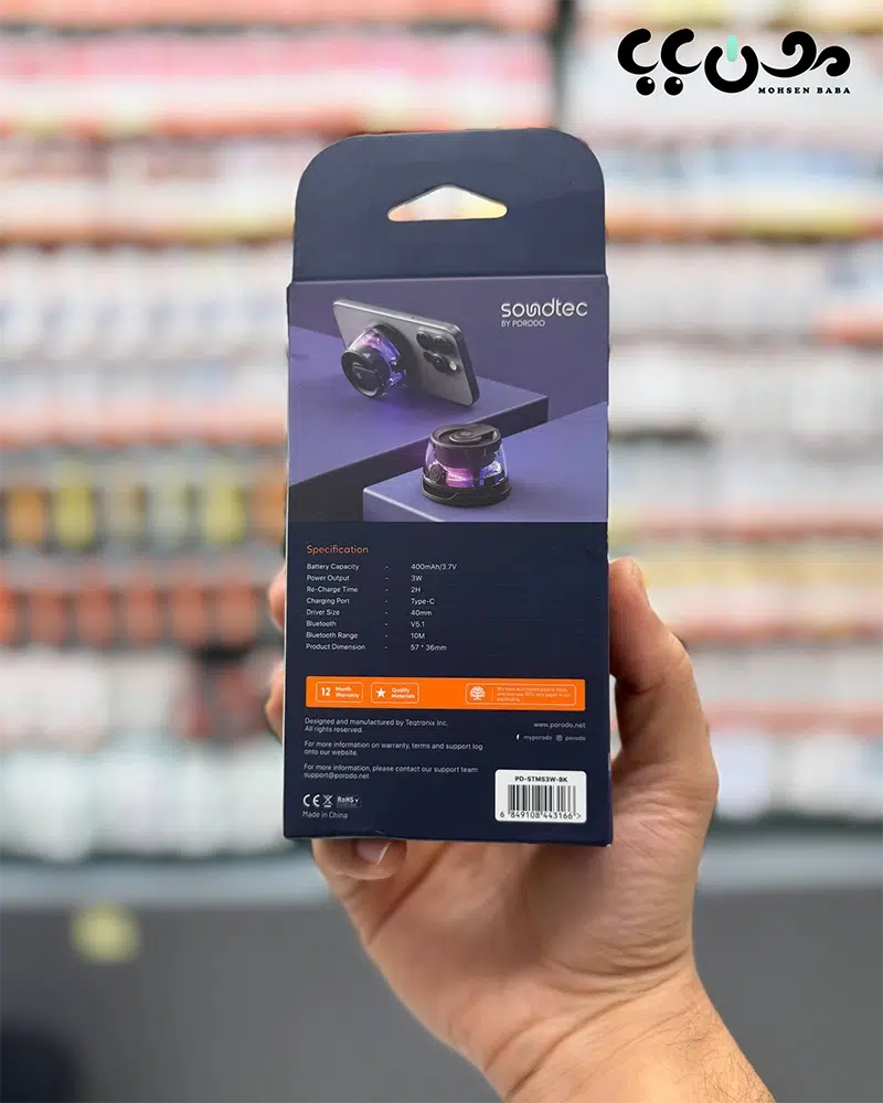 اسپیکر PRODO CHARME دارای درگاه شارژ USB Type-C است که سرعت و پایداری شارژ بهتری نسبت به پورت‌های قدیمی ارائه می‌دهد.